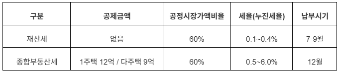 재산세는 지방세, 종부세는 국세로 구분되며 과세 기준은 공시가격을 기반으로 합니다. 정부가 공시하는 부동산 가액을 기준으로 일정 비율을 곱해 세금이 산출되는 구조입니다.