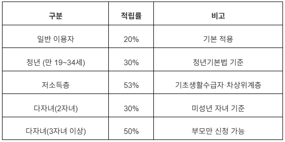 청년, 저소득층, 다자녀 구분은 자동 적용되지 않으므로 앱에서 직접 신청해야 높은 적립률을 받을 수 있습니다.