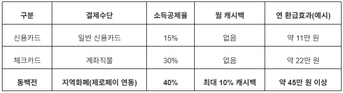- 전통시장·소상공인 매장 중심 결제 → 캐시백+소득공제 동시 적용