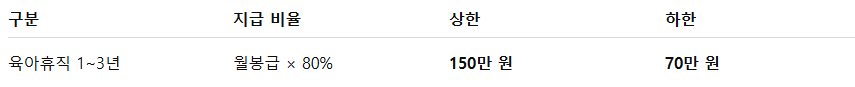 가장 핵심적인 내용은 육아휴직 기간 동안 받던 월봉급의 80%를 지급한다는 점입니다.