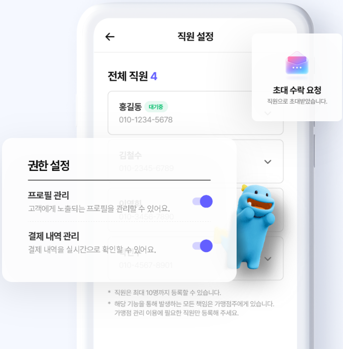 직원 초대 및 권한 부여로 매장 운영 보조 가능