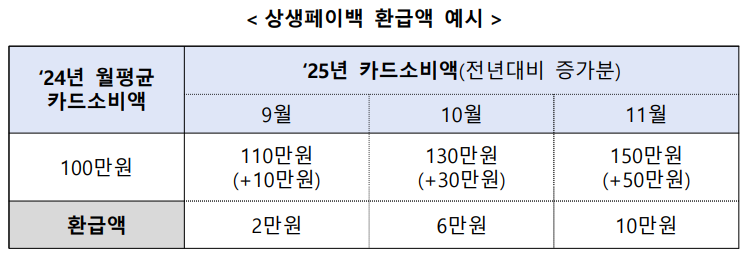 2025년 9월부터 11월까지의 카드 사용액이 2024년 월평균보다 늘어난 금액의 20%를 돌려주는 방식으로 운영됩니다.