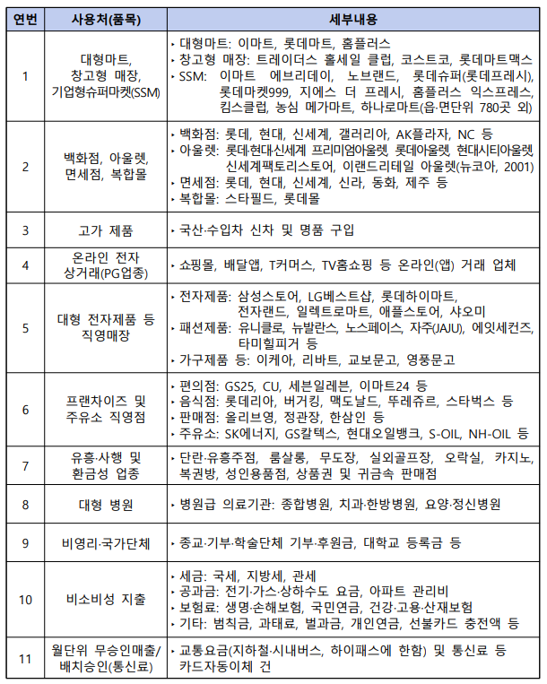 예를 들어 세금 납부, 공과금, 보험료, 주식·코인 거래, 해외 결제, 유흥업소 등은 인정되지 않습니다.