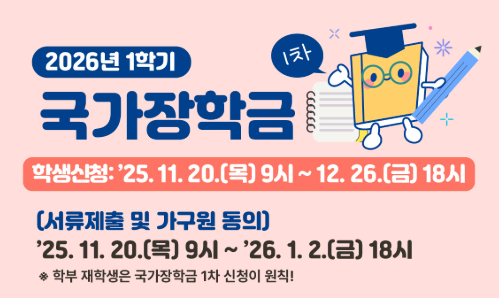 국가장학금은 매 학기 1차 → 2차로 나누어 신청하며, 한국장학재단 홈페이지에서 바로 신청이 가능합니다.